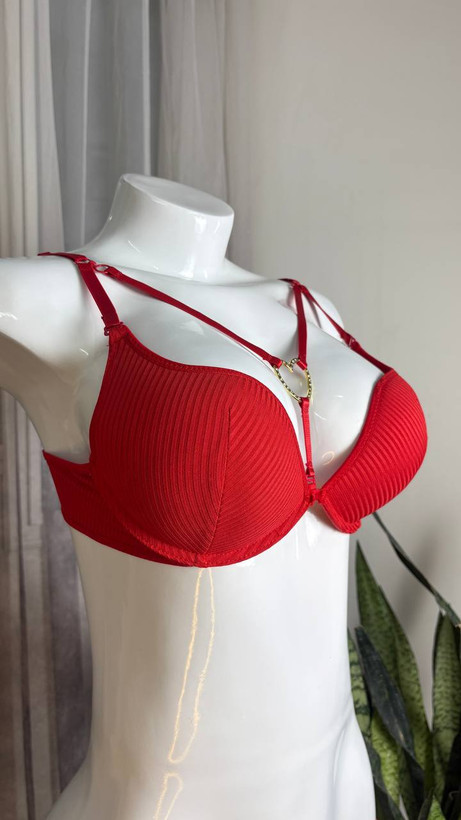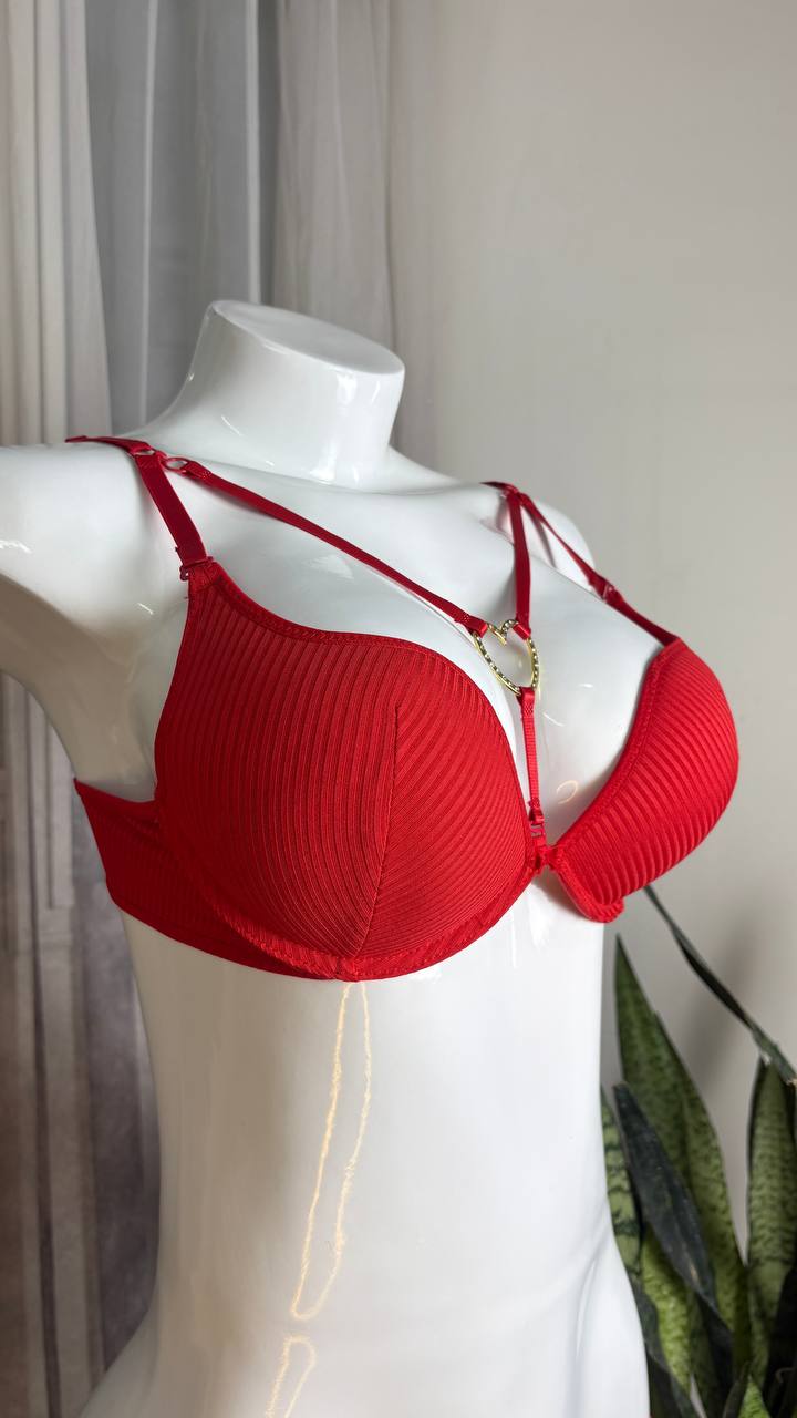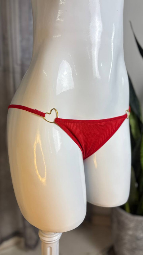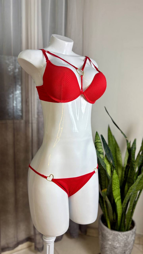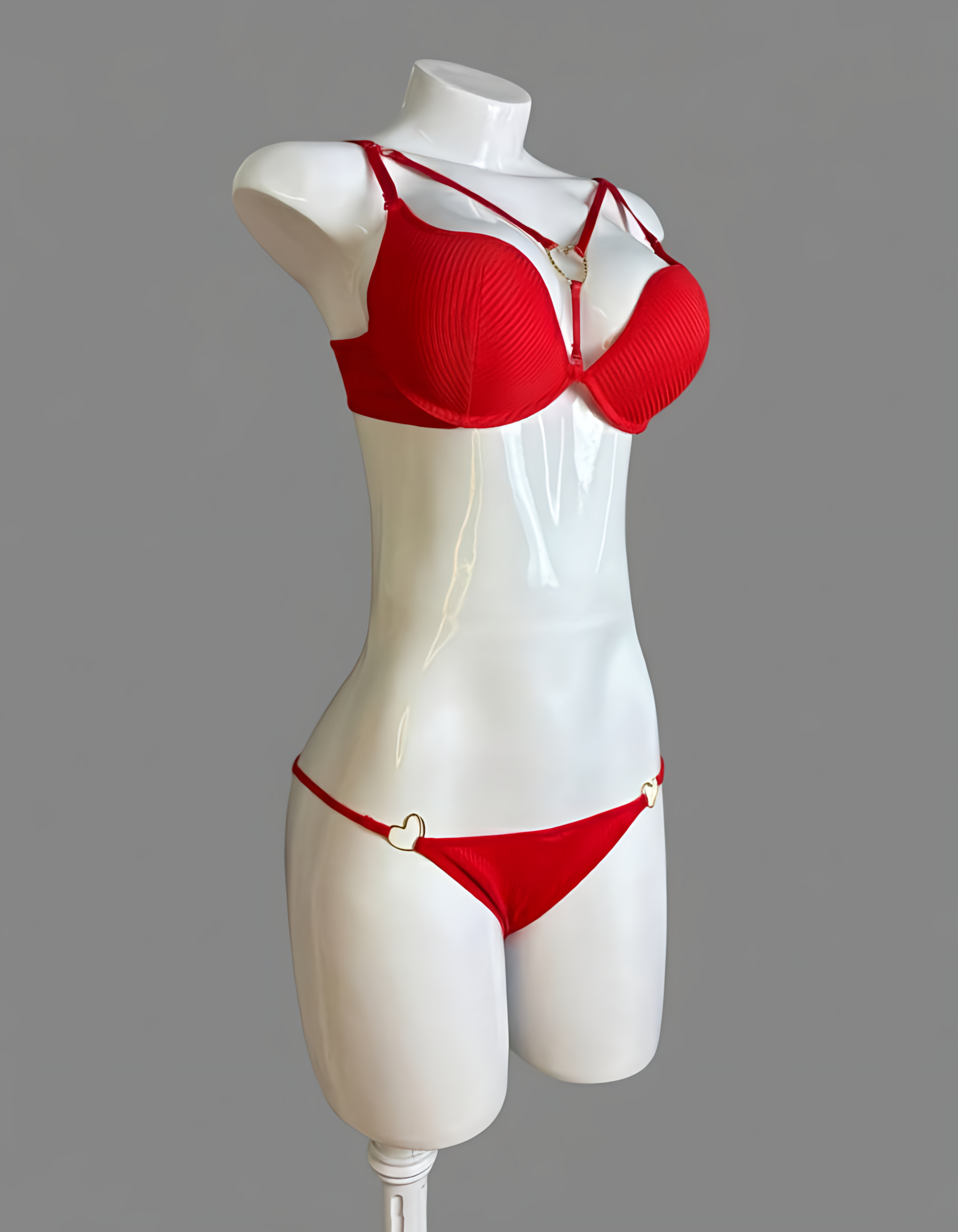 این ست پراحساس، نسخهای پرشور و جسورانه از ست اویز قلب است که در رنگ قرمز پررنگ و نمادین ارائه میشود. آویز قلبی شکل از فلز ضدحساسیت ساخته شده و نماد عشق عمیق، اشتیاق و جسارت است. طراحی هوشمندانهی قابلیت جدا شدن بندها همچنان امکان ایجاد مدلهای مختلف (کراس بک، هالتر و...) را فراهم میکند. سوتین دارای کاپ نازک سایز B و ویژگی فنردار است و شورت آن ساده طراحی شده تا تمرکز اصلی بر روی این نماد عشق آتشین باشد.